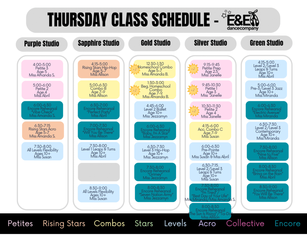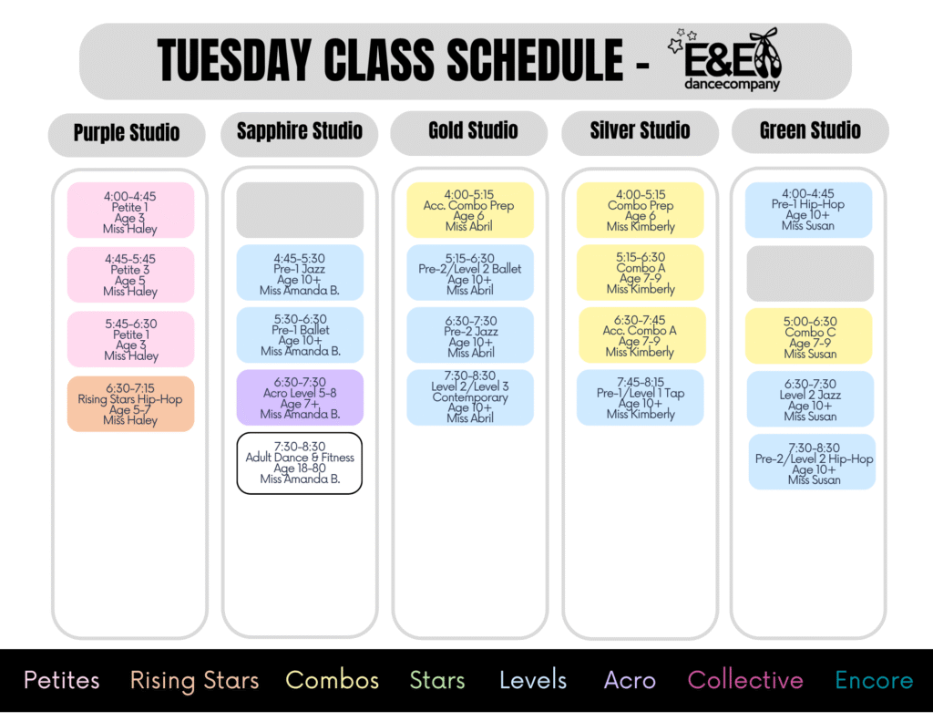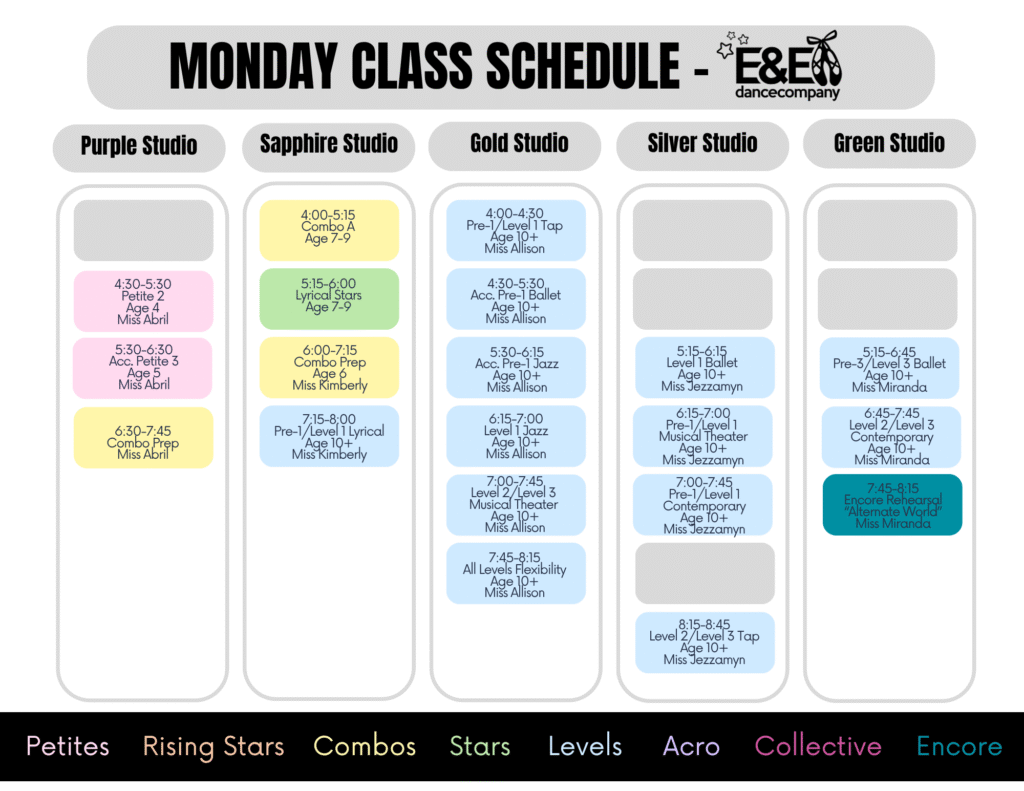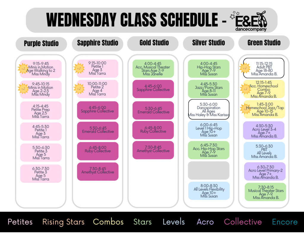 – We added LOCKERS in our upstairs lounge! Dancers ages 6th grade and up can rent a locker. Suggestions items to leave on site are: hair stuff, hygiene items, stretch bands, snacks, water bottle, notebook and pens/pencils…all the little stuff that rolls around your dance bag now has a home!